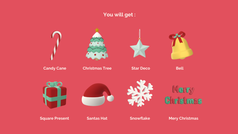 8 different Christmas icons | 10 png images | Obj files | Html snippets | Link to the AR/VR icons