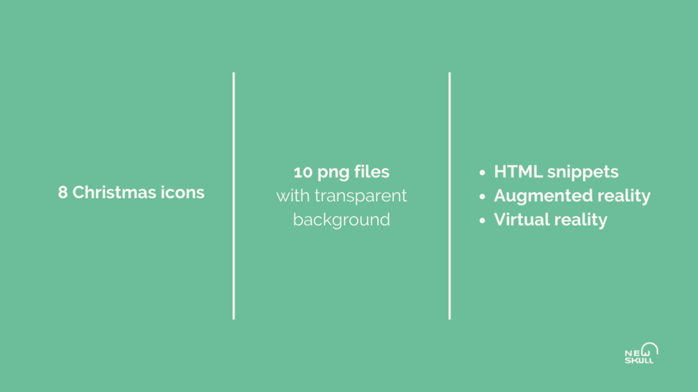 8 different Christmas icons | 10 png images | Obj files | Html snippets | Link to the AR/VR icons